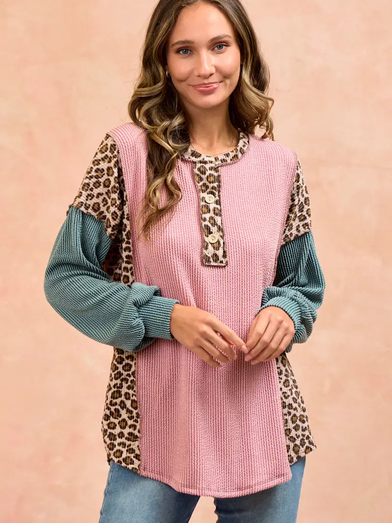 Our standby me animal print top is made of rib material. Features a round neckline with banded cuffs. This top has a standout a unique animal and solid print. Has functional button-down detail. Top has a chic color block that brings a contemporary flair to your look.